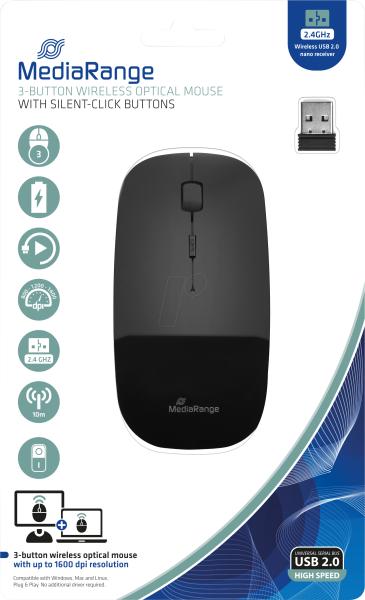 MediaRange Maus Wireless 3 Tasten, geräuscharm schwarz glänz (MROS215)